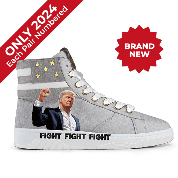 Introducing the FIGHT FIGHT FIGHT High-Tops in Striking Silver. On July 13, 2024, an assassination attempt was made on President Trump at a rally in Butler, PA. Despite the attack, Trump stood tall and resilient, leading the crowd with the powerful chant "Fight, Fight, Fight."