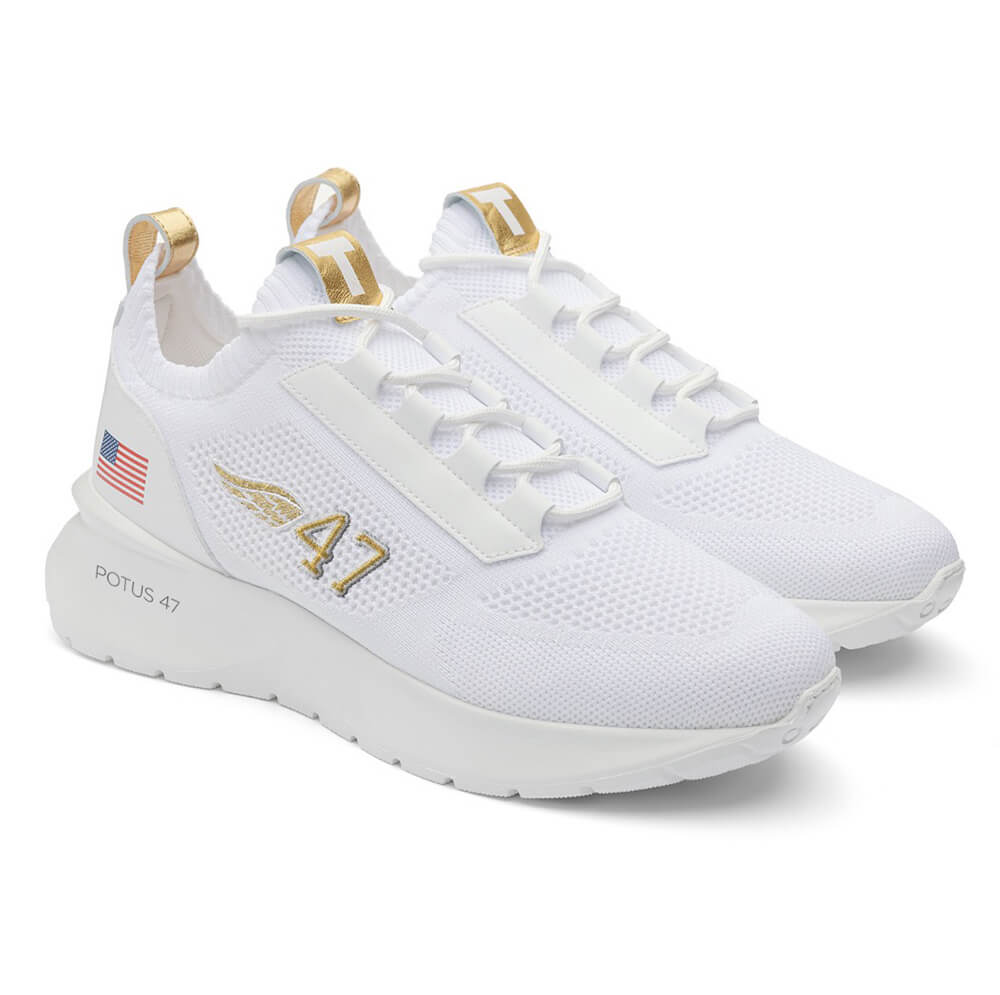 Featuring a crisp white knit design accented with a striking gold '47'—symbolizing Trump's second term as President—these sneakers are a tribute to resilience and leadership. The proud American flag detail on the heel salutes the enduring spirit of freedom and greatness.